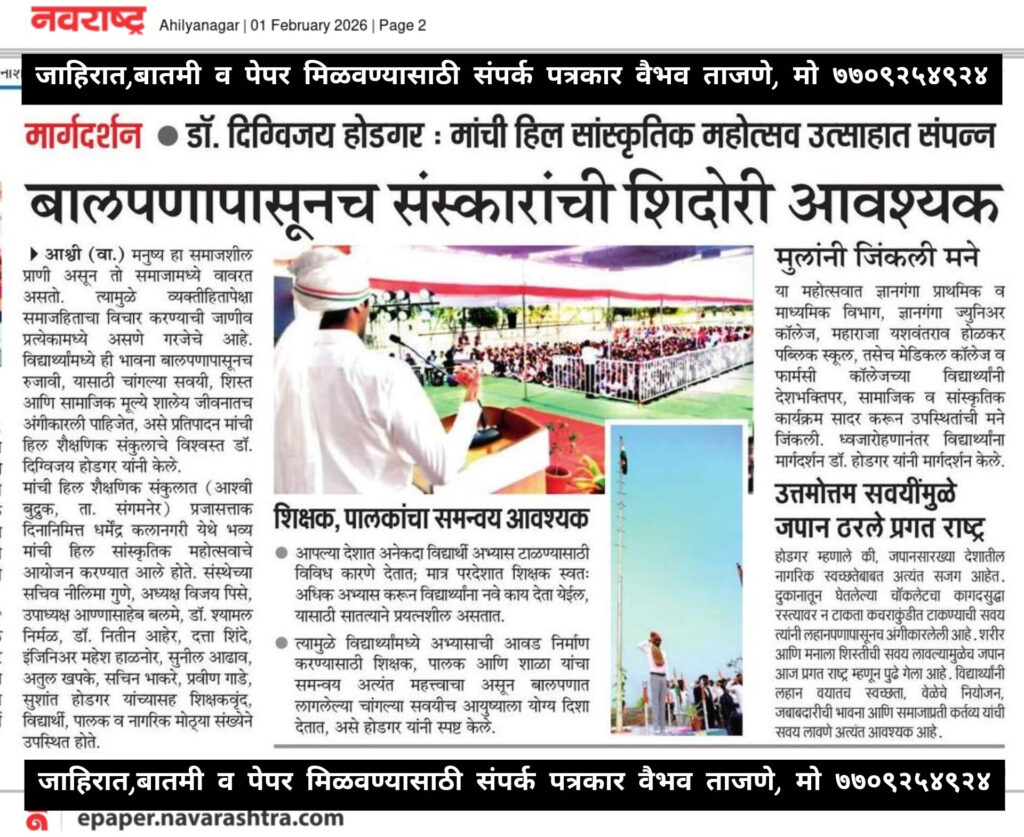 जाहिरात,बातमी व पेपर मिळवण्यासाठी संपर्क पत्रकार वैभव ताजणे, मो ७७०९२५४९२४